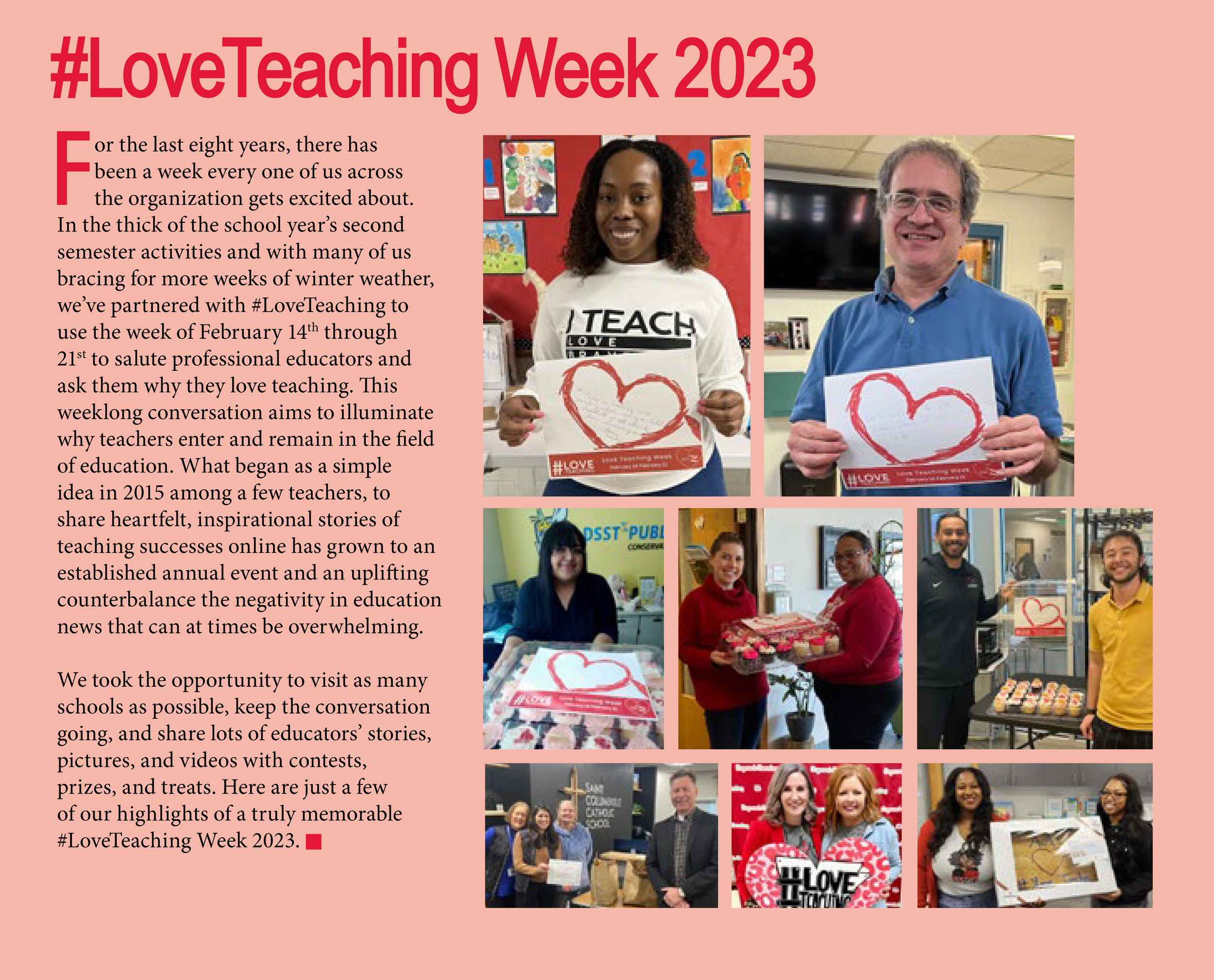 Valentine’s Day, February 14th, each year marks the beginning of a weeklong conversation to illuminate why educators enter and return to the field of teaching. Love Teaching Week celebrates the many sources of fulfillment and meaning rather than the focus on the many challenges faced by the profession